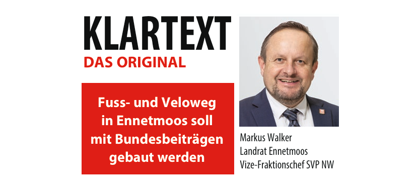 Dank der Unterstützung der SVP kann der bestehende Fuss- und Veloweg in Ennetmoos von St. Jakob bis zur Kantonsgrenze für 4,7 Mio. weiter gebaut werden. Damit wird eine wichtige Lücke im Nidwaldner Radwegkonzept geschlossen. Das Ziel ist der nahtlose Anschluss zum geplanten Fuss- und Veloweg des Kanton OW, welcher im ersten Ausbau bis zum Sand weitergeführt wird.
