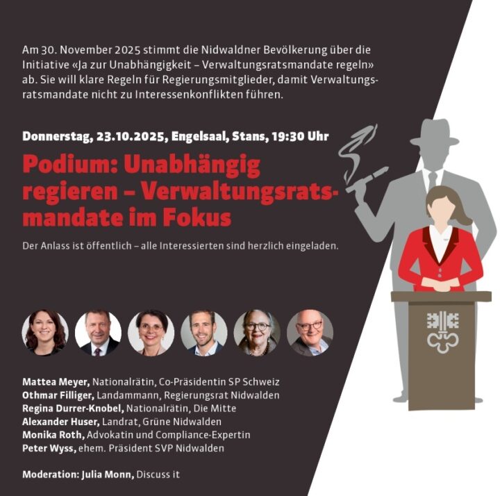 Am 30. November 2025 stimmt die Nidwaldner Bevölkerung über die Initiative „Ja zur Unabhängigkeit – Verwaltungsmandate regeln“ ab. Sie will klare Regeln für die Regierungsmitglieder, damit Verwaltungsratsmandate nicht zu Interessenskonflikte führen.
