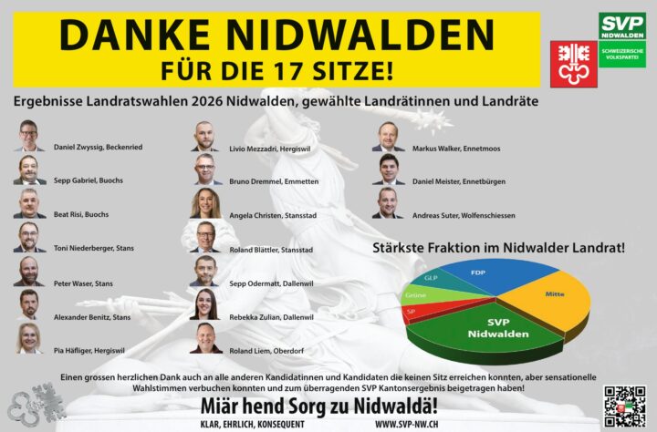 Die Gesamt-Erneuerungswahlen 2026 sind Geschichte. In 6 Gemeinden ist die SVP nun wählerstärkste Partei. Die Fraktion ist von 15 auf 17 gewachsen und ist nun die stärkste Fraktion im Landrat Nidwalden.